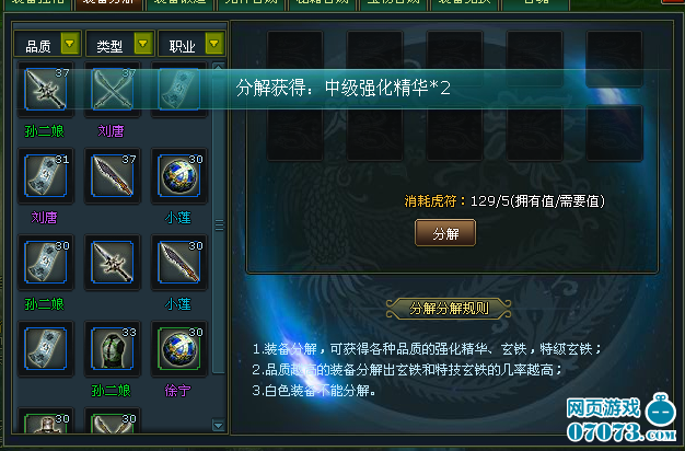 108將裝備的強化是需要消耗虎符的。雖然虎符會自動恢復(fù),但是速度還是慢了點。而且攻打據(jù)點怪物也是要消耗虎符的,所以消耗量還是很大的。分解后的強化精華是裝備強化等級高了之后,繼續(xù)提升裝備強化等級的必備品。所以,不要說虎符不夠了之類的話,這玩意還是很稀有的。