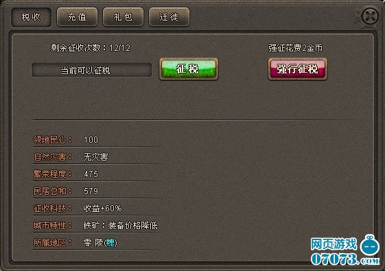 玩家每天在主城的稅收界面有12次征收機(jī)會,每次征收所得資金受民心、民房等級及民房數(shù)量影響。民心越高獲得的稅金越高,民心為1-100;民房等級越高、數(shù)量越多,征收所得的資金越多,稅收不會降低民心。