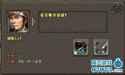 上圖為攻擊敵方軍隊之前展示的軍隊信息界面,注意被紅色圈住的部分描述為:“武將:胡軫(絕對掉落)”。只要在這個部分具有武將名字便說明攻擊這只軍隊是否能抓捕武將。括號中的(絕對掉落)說明了此武將是會絕對掉落的。當(dāng)描述為(必逃)時,說明這個時候的您沒有足夠的能力抓捕到該武將。
