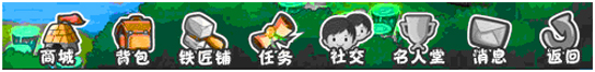 上圖是游戲中右下角的主選界面,從左往右依次是:商城、背包、鐵匠鋪、任務(wù)、社交、名人堂、消息、返回。