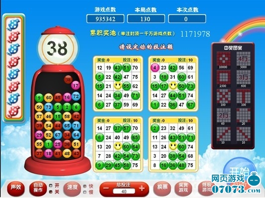 常規(guī)游戲:“常規(guī)游戲”是玩家設定好投入點數(shù),點擊開始鍵,系統(tǒng)會隨機搖出37個(快樂賓果)或44個(甜蜜賓果)號碼,當票面上的號碼與開獎號碼一致時,該單元格將被標注,當標注的單元格呈賓果特定中獎圖案時,即中得對應游戲點數(shù)。(下圖為甜蜜賓果常規(guī)游戲)