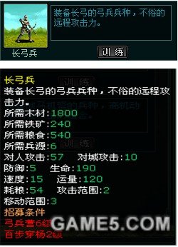 長(zhǎng)弓兵:在攻擊力上相較于普通弓箭兵有質(zhì)的飛躍。缺點(diǎn)是防御力偏低,同樣為壓制騎兵特效的兵種。造價(jià)中等,由于其先天對(duì)騎兵克制,推薦量產(chǎn)一些守家,以備不時(shí)之需。