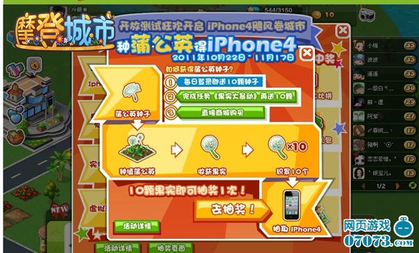 即日起玩《摩登城市》即可在游戲當中獲取蒲公英種子,玩家們只需要把種子播撒在自己的田野里,收獲成熟的蒲公英,積累滿10個果實,就可以兌換一次抽取iphone4手機的機會。