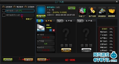 1)紅箭頭1:工廠生產(chǎn)狀態(tài)為“空閑”可選中此工廠進(jìn)行生產(chǎn);
