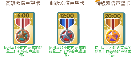 1、雙倍聲望卡:共有三種,使用后,完成聲望工作便會獲得雙倍聲望獎勵,分別持續(xù)6小時,12小時,20小時的效果!