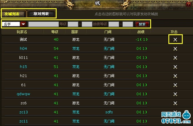 3、選擇“攻城列表”則進(jìn)入可以進(jìn)行對(duì)戰(zhàn)的玩家列表,在列表中選擇一名玩家,點(diǎn)擊列表右邊的攻擊圖標(biāo)就可以對(duì)該玩家發(fā)起攻城戰(zhàn)了;