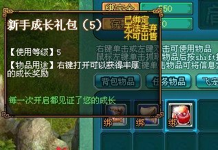 到達5級所有玩家都會獲得有天降的新手成長禮包哦,右鍵打開將獲得豐富的各種獎勵!