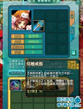 結(jié)婚后雙方獲得道具“結(jié)婚戒指”。“結(jié)婚戒指”的作用是能夠使夫妻雙方中的一人立刻傳送到另一方身邊(跑商、押鏢時(shí)不能使用)。結(jié)婚戒指的初始使用次數(shù)為50次,使用次數(shù)消耗完后需補(bǔ)充次數(shù)才可正常使用。