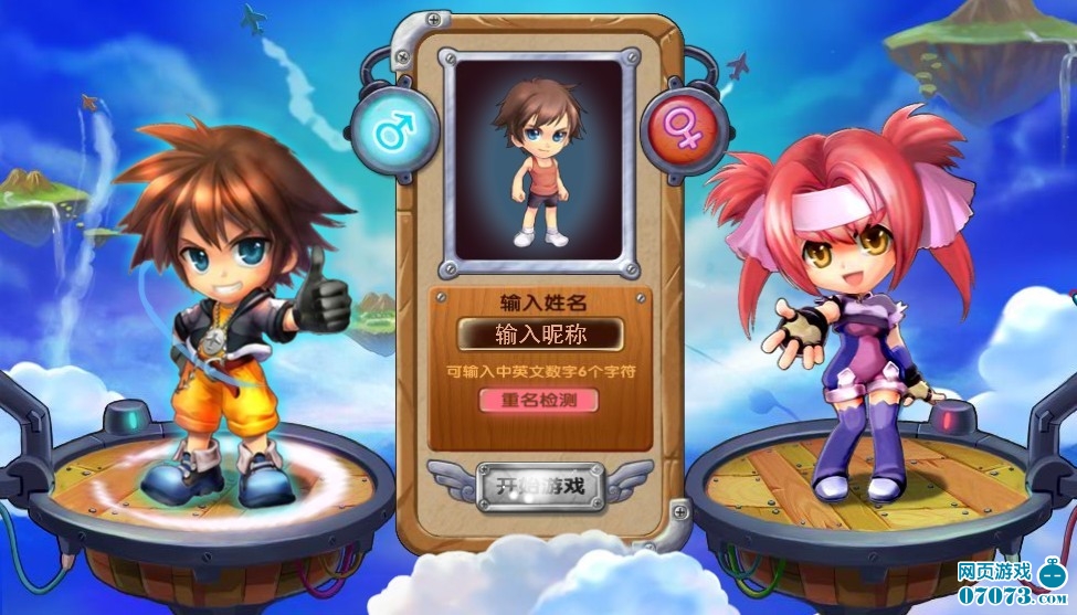 首次登陸游戲后,會(huì)進(jìn)入創(chuàng)建角色界面。畫(huà)面中男女兩個(gè)人物角色,選中其中一個(gè),添上你的昵稱(chēng)。