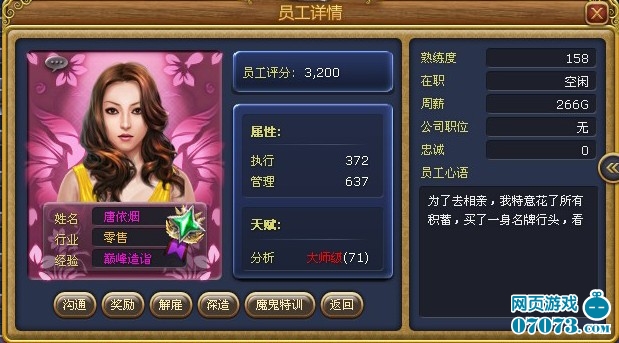 玩家平時可以進行員工操作,員工深造可以提升員工的經(jīng)驗,員工溝通、員工獎勵可以提升員工的忠誠度。