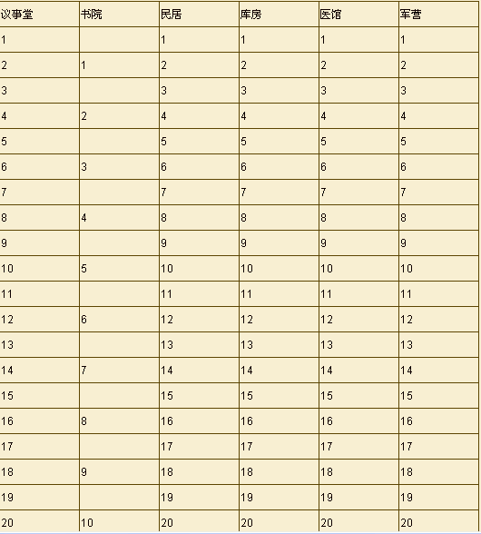 議事堂是玩家塢堡中的核心設(shè)施,您可在這里查看到玩家聲望勢(shì)力、爵位官位、擁有武將與俸祿支出6種基本信息。玩家每到達(dá)一定聲望即可對(duì)其進(jìn)行升級(jí),升級(jí)到第3級(jí)時(shí)刻加入其他勢(shì)力,第10級(jí)時(shí)可創(chuàng)建勢(shì)力,同時(shí)議事堂的級(jí)別也將會(huì)影響塢堡其他設(shè)施的升級(jí)。附上議事堂與設(shè)施級(jí)別關(guān)聯(lián)表。