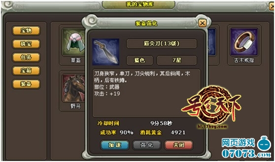 當(dāng)然,如果有些大俠不想等待冷卻時(shí)間的話,也可以消耗一定的元寶來進(jìn)行加速。讓您的將領(lǐng)早日裝備神兵利器,在戰(zhàn)場上奮勇殺敵!