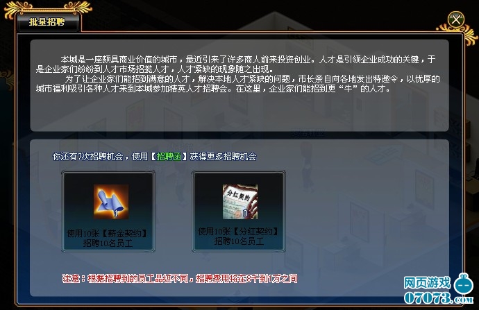 3. 玩家可以選擇使用分紅契約和薪金契約來提高招聘到高級(jí)員工的幾率。