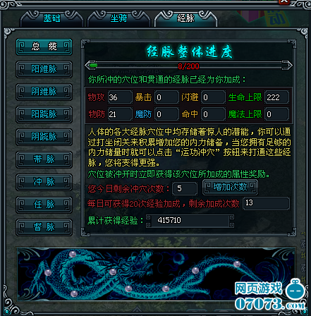 人體的各大經(jīng)脈穴位中均存儲(chǔ)著驚人的潛能,你可以通過(guò)打坐或者真氣儲(chǔ)量時(shí),就可以點(diǎn) 擊“運(yùn)動(dòng)沖穴”按鈕來(lái)打通這些經(jīng)脈穴位,你將變得更強(qiáng)。經(jīng)脈打通沒(méi)有順序,但是經(jīng)脈里面的穴位一定要循序漸進(jìn)的。
