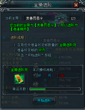夢隋唐每個(gè)人物角色可以領(lǐng)取一個(gè)新手卡,也就是游戲禮包,禮包內(nèi)容真的很豐富,其中最讓玩家熱衷的就是那3000的銀票,一張銀票是一兩也就說,3000的銀票=3000的銀兩。看起來3000的銀兩很多,但是當(dāng)你想要升級(jí)坐騎時(shí)候就發(fā)現(xiàn)了,這遠(yuǎn)遠(yuǎn)不夠。每次進(jìn)階消耗100點(diǎn)的銀兩,有人會(huì)說那3000的銀兩升到5 6階應(yīng)該沒有問題。這里說下,當(dāng)你進(jìn)階到賞善罰惡令,最少要升級(jí)5次以上,每次進(jìn)階失敗會(huì)增長幸運(yùn)點(diǎn)數(shù)(說是提升進(jìn)階成功率的,其實(shí)我告訴你100%的幸運(yùn)點(diǎn)數(shù)后期的進(jìn)階都不是100%成功),這東西就是隨機(jī)的只是說幸運(yùn)點(diǎn)數(shù)高了,成功大了而已并不是絕對(duì)的。