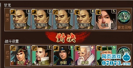 從上面可以看出,甘龍部隊(duì)偏于防守。兩騎兵自不用說(shuō),挫銳和妙手回春一個(gè)克制對(duì)手技能,一個(gè)增強(qiáng)己方持續(xù)作戰(zhàn)能力,加上騎兵的高防,自然是嚴(yán)密的防守。而步兵由于技能掩護(hù)的影響,也同樣偏于防守。加上破甲技能在前,弓兵橫掃在后,也就無(wú)形中增強(qiáng)了弓兵的打擊能力。所以在布陣之時(shí),我們要首先從分擔(dān)傷害同時(shí)防御力不如騎兵的步兵開(kāi)始。