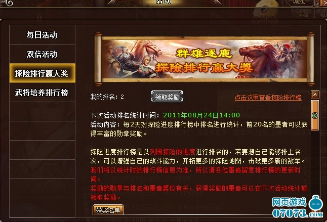3.武將培養(yǎng)。這個和探險排行一樣,對于有條件的玩家有優(yōu)勢。武將培養(yǎng)活動只對各個武將培養(yǎng)排名前三位的玩家發(fā)放獎勵。要求相對較高。