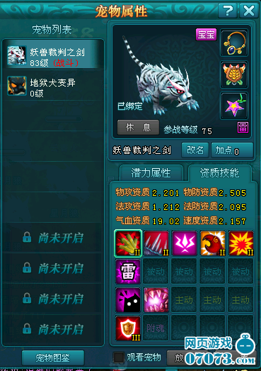 資質(zhì)與技能上我的個(gè)人看法是這樣的,洗一個(gè)物攻資質(zhì)為至少為1.145以上的物攻資質(zhì)吧,老虎的氣血也挺有講究,上8的氣血資質(zhì)挺不錯(cuò)的,其余的資質(zhì)你姑且 可以忽略,以后可以慢慢抓個(gè)烏龜練練,抽資質(zhì)!慢慢打入!幾次后也應(yīng)該蠻不錯(cuò)了。老虎氣血資質(zhì)跟物攻資質(zhì)很重要。因?yàn)闅庋臀锕ビ觅Y質(zhì)卡很難抽到,至少我 這么認(rèn)為。我試過好幾次都是抽出物理防御和法術(shù)防御。