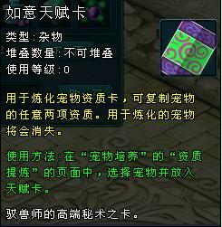 使用道具“天賦卡”可將寵物的某項資質(zhì)提取出來,得到“資質(zhì)卡”,用于資質(zhì)植入。
