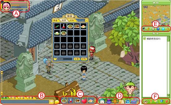此區(qū)域是游戲的輔助功能操作區(qū)域,包括:視頻會議,聲音開關(guān),場景地圖,世界地圖,傳送列表,鎖定地圖5個(gè)項(xiàng)目按鈕,玩家可以通過該區(qū)域的場景縮略地圖更直觀的找到當(dāng)前位置F:其他功能菜單:此區(qū)域的功能菜單包括:網(wǎng)頁精靈管理,幫助信息,查找好友,系統(tǒng)信息,退出游戲5個(gè)項(xiàng)目按鈕,玩家可以通過幫助信息里的內(nèi)容了解操作的簡便性和所有功能的快捷鍵使用方法