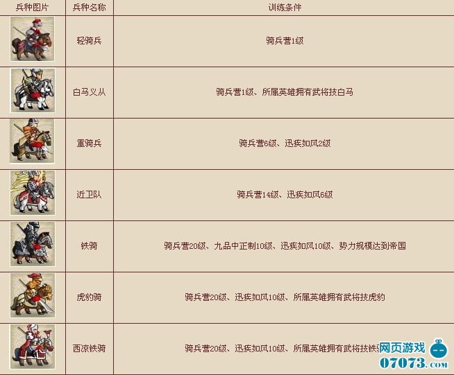 騎兵:只能在玩家自己封地的騎兵營(yíng)中訓(xùn)練 ,騎兵營(yíng)等級(jí)越高就能訓(xùn)練越高等級(jí)的騎兵。