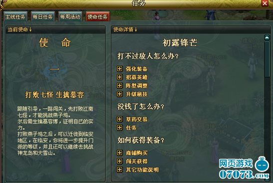 主線任務:引導玩家一步步熟悉游戲的各種功能、系統(tǒng)。任務為接續(xù)形式,必須首先完成低級任務才能出現(xiàn)后續(xù)任務。熱血武林最給力的任務玩法,羅列最全的任務描述,銀兩獎勵盡收眼底。