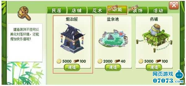 選擇游戲右下角的建造,選擇功能標(biāo)簽頁,在那就可以選擇建造鍛冶屋啦!