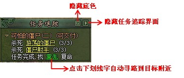 在任務(wù)描述和任務(wù)目標(biāo)的介紹中,玩家會看到有部分文字帶有下劃線,點擊帶下劃線的文字,如果下劃線的文字所指向的目標(biāo)與玩家所在的地圖相同,則可以自動移動到下劃線所指向的,目標(biāo)附近。