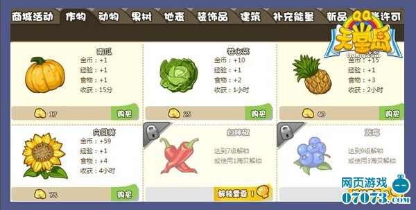 小島上一片片有趣的植物總是不講理的霸占著寶貴的土地,首先讓我們把這些雜草、野花給處理掉。處理干凈后,我們點(diǎn)開(kāi)游戲中的商城,選中“作物”之后,就會(huì)看到許許多多的種子正在熱銷(xiāo)中。其中熟知的有南瓜、卷心菜,更有精美的藍(lán)莓、西瓜等等。在這酷暑中,如果躲在樹(shù)蔭下,躺在搖椅上,來(lái)一口清涼多汁的水果,那將是多么愜意的事啊!作物種子的播種資格,會(huì)根據(jù)你的等級(jí)提升而開(kāi)放。如果你急著想種,當(dāng)然需要支付額外的金貝殼哦!