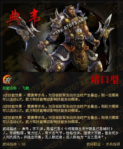 典韋飛戟技能:技能效果需攜帶步兵,對(duì)目標(biāo)敵軍發(fā)動(dòng)攻擊時(shí)產(chǎn)生暴擊,則一定概率可以連動(dòng)1次。武力和技能等級(jí)影響技能發(fā)動(dòng)概率。目前典韋還未見有何威力,一般防守時(shí)讓他帶步兵站崗堵口子。
