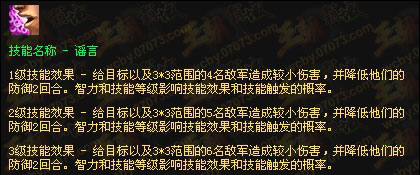 荀彧、賈詡等謠言技能:技能效果給目標(biāo)以及3*3范圍內(nèi)的4名敵軍造成較小傷害且降低防御2回合,智力及技能等級(jí)決定發(fā)動(dòng)概率。荀彧,賈詡為三星智力成長,為謠言將中智力成長最高的將領(lǐng),帶弓兵在后方國戰(zhàn)中不遜于部分較弱的藍(lán)色武將。