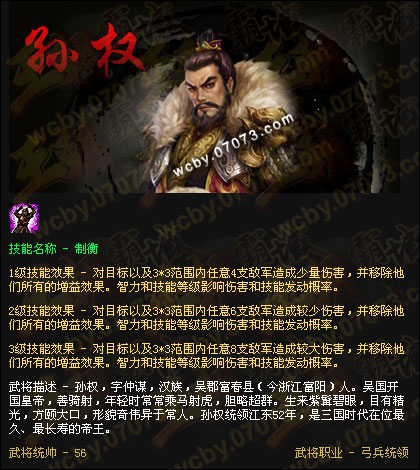 孫權(quán)技能制衡:技能效果對(duì)目標(biāo)以及3*3范圍內(nèi)任意4支敵軍造成少量傷害,并移除他們所有的增益效果。智力和技能等級(jí)影響傷害和技能發(fā)動(dòng)概率。