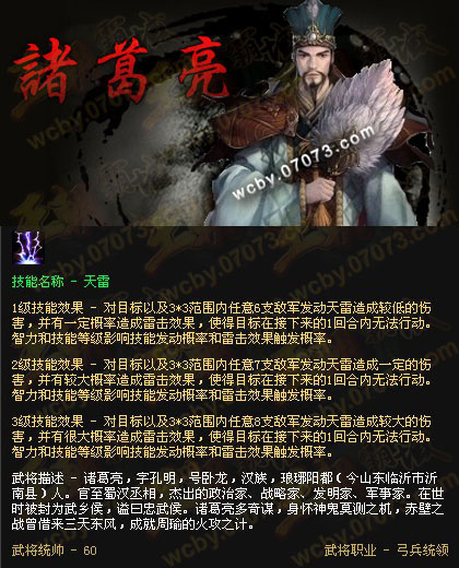 諸葛亮天雷技能:技能效果對(duì)目標(biāo)以及3*3范圍內(nèi)任意6支敵軍發(fā)動(dòng)天雷造成較低的傷害,并有一定概率造成雷擊效果,使得目標(biāo)在接下來的1回合內(nèi)無法行動(dòng)。智力和技能等級(jí)影響技能發(fā)動(dòng)概率和雷擊效果觸發(fā)概率。諸葛亮是搶手貨,為什么說呢?因?yàn)槲鋵⒅杏锌刂萍寄芫蛯僦T葛亮,一般步兵炮灰頂在最前面,在后面的就是隊(duì)伍里的DPS,天雷技能是群技能,打國戰(zhàn)時(shí)候相當(dāng)給力。