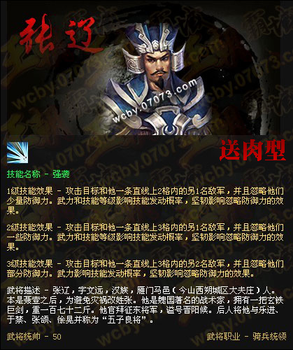 技能效果攻擊目標(biāo)和他一條直線上2格內(nèi)的另1名敵軍,并且忽略他們少量防御力。武力和技能等級(jí)影響技能發(fā)動(dòng)概率,堅(jiān)韌影響忽略防御力的效果。目前還未見40級(jí)以上的,不知后期威力如何。前期武技是直線的,效果不太好。張遼和祝融夫人類似,但沒祝融夫人的偷懶送肉現(xiàn)象。
