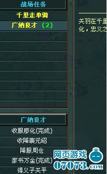 進(jìn)入戰(zhàn)場(chǎng)后是在許昌,看下任務(wù)欄,有主線任務(wù)“千里走單騎”和支線任務(wù)“廣納良才”2套。