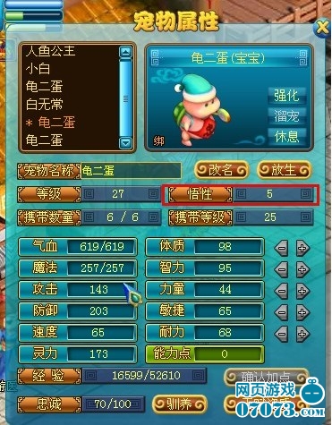 使用快捷鍵“C”或者通過點(diǎn)擊界面左上角的“寵物頭像”打開寵物屬性面板。在面板中,我們可以看到當(dāng)前該寵物的悟性數(shù)值。(如圖紅色方框內(nèi))