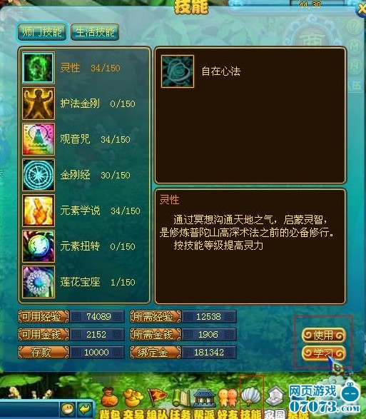 請(qǐng)您注意游戲界面中的“技能”按鈕。點(diǎn)擊按鈕即可進(jìn)入技能學(xué)習(xí)頁(yè)面。
