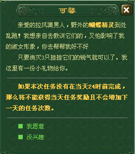 再未接取該任務(wù)時,每次打開對話所看到的任務(wù)內(nèi)容是不一樣的哦。因此玩家可以自由選擇自己喜歡的任務(wù)內(nèi)容,反正獎勵是少不了的。