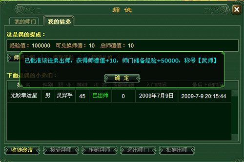 達(dá)到拜師或收徒的要求后,只需要一方向另一方發(fā)出拜師請求或是收徒請求,被請求者同意之后就能夠輕松便捷的結(jié)為師徒啦,徒弟還能通過師徒界面查看到同門師兄弟呢!而且,首次拜師就可以獲得50禮券哦。雖然拜師收徒的步驟十分簡單,但俗話說“一日為師終身為父”,一旦出師之后就無法再解除師徒關(guān)系了,各位玩家還是要慎重才行。