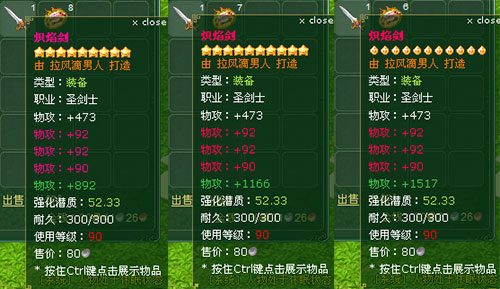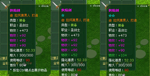 強(qiáng)化后裝備的神奇屬性以圣劍士90級(jí)武器“熾焰劍”為例,未強(qiáng)化與強(qiáng)化一、二星之后的對(duì)比屬性圖如下:
