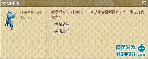 再比如,清幽谷的NPC清幽使者因?yàn)榻?jīng)常被人打,所以就說(shuō):“我最討厭你們來(lái)打我的,一點(diǎn)技術(shù)含量都沒有,有本事去打我老大!”