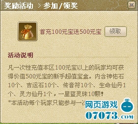 活動四、初次充值100元寶就送價值500元寶超值禮盒