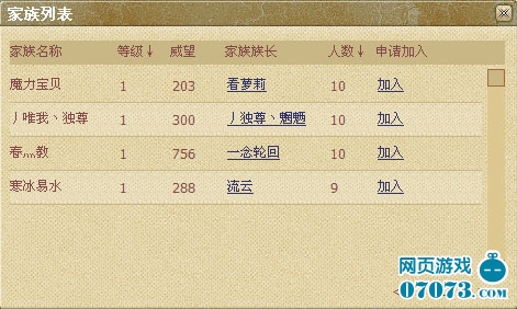 在此次的夢(mèng)幻內(nèi)測(cè)中,家族系統(tǒng)自然也是一大重頭戲,也是十分受玩家歡迎的。從進(jìn)入游戲伊始,就有不少玩家大嚷著看誰能第一個(gè)創(chuàng)建家族。很多人都為此目標(biāo)在努力的沖級(jí)賺錢。終于筆者興奮的在刃雪城家族管理員綺煙處看到了已經(jīng)創(chuàng)建的的4個(gè)家族。