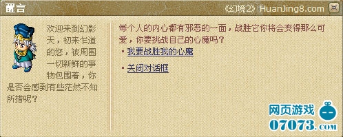 副本規(guī)則:每日任意時間可到【幻影天.醒言】處進入,每人每天可進入一次,中途任何原因退出副本,次數(shù)照常計算。副本持續(xù)時間1小時,時間結(jié)束后將會自動退出地圖。1小時內(nèi)將會出現(xiàn)自己心魔,戰(zhàn)勝自己的心魔,戰(zhàn)勝自己黑暗的一面!將有機會提出心魔修煉的經(jīng)驗丹!不過心魔的能力也是不可小視的。