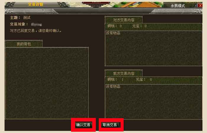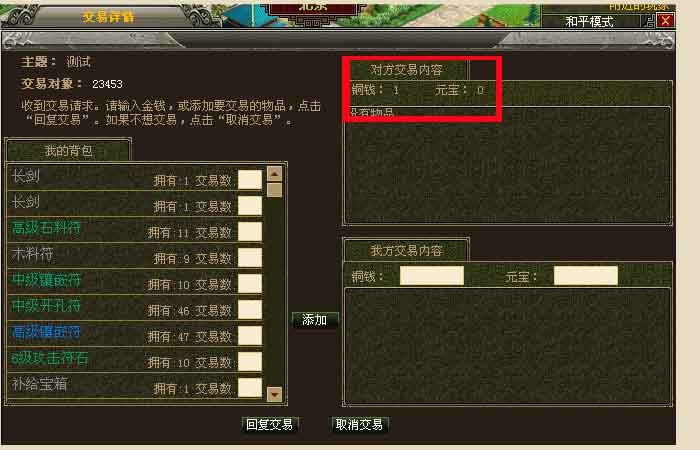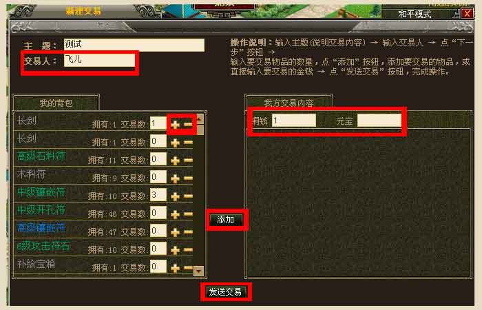 2、創(chuàng)建交易:檢測交易人的名字、添加交易物品(+、-為物品的增減)、輸入交易金額(銅錢或元寶),最后發(fā)送交易。