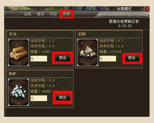 策略四:點(diǎn)擊功能菜單中的“內(nèi)政”,進(jìn)入征稅列表,可以看到“貿(mào)易”,通過(guò)貿(mào)易把木材、石料、鐵礦買(mǎi)個(gè)系統(tǒng),可獲得銅錢(qián)。