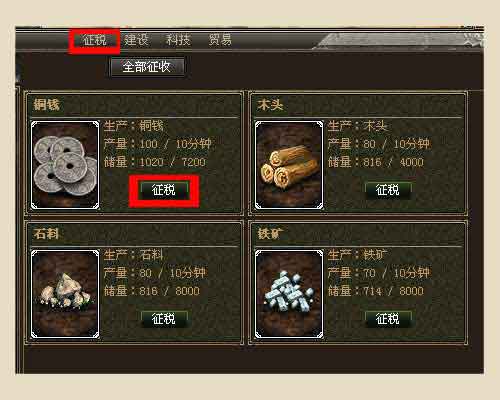 策略一:點(diǎn)擊功能菜單中的“內(nèi)政”,進(jìn)入征稅列表,可以看到銅錢(qián)的“征稅”按鈕,點(diǎn)擊即可征收銅錢(qián)。