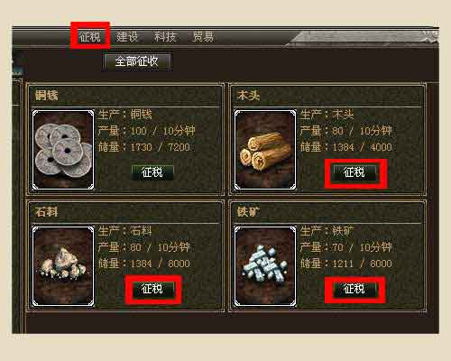 策略一:點擊工具欄中的“內(nèi)政”,進(jìn)入征稅列表,可以看到各類資源的“征稅”按鈕,點擊即可征收。