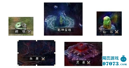 (2)你還能在地圖上找到一些資源點(diǎn),有銅錢、朱果、仙石、靈泉和乾坤寶地(注:乾坤寶地可以獲得三種定量資源)不同等級有不同的資源量。攻擊來獲得資源,對應(yīng)名稱的資源點(diǎn)可以獲得相應(yīng)的資源點(diǎn)。如下圖