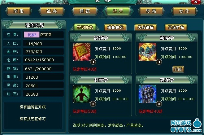 提升建筑的基本作用是技藝級別越高,效率越高,產(chǎn)量上限也會更高。在功能表上點(diǎn)擊『玄界』,有一個『技藝』按鈕,點(diǎn)擊進(jìn)去可以發(fā)現(xiàn)如圖(1)所示,建筑可以分為四大類:1.學(xué)識修煉 2.采集技藝 3.天兵訓(xùn)練 4.天兵擴(kuò)充。其每一類技藝都有不同,如圖(2)可以看到升級是需要玩家等級、費(fèi)用條件與時間符合。如下
